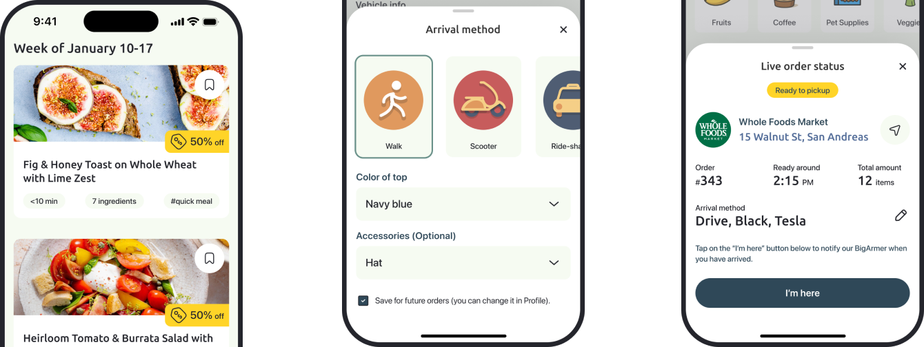 Inspired by the hassle of wasting my precious morning time looping around for parking while my coffee’s getting cold inside the store, I wanted to design a service that brings any kind of product straight to the curb for quick pickup. Whether walking a dog, running a quick errand, or pushing a stroller, BigArm helps people pick up their orders without the stress of going inside.