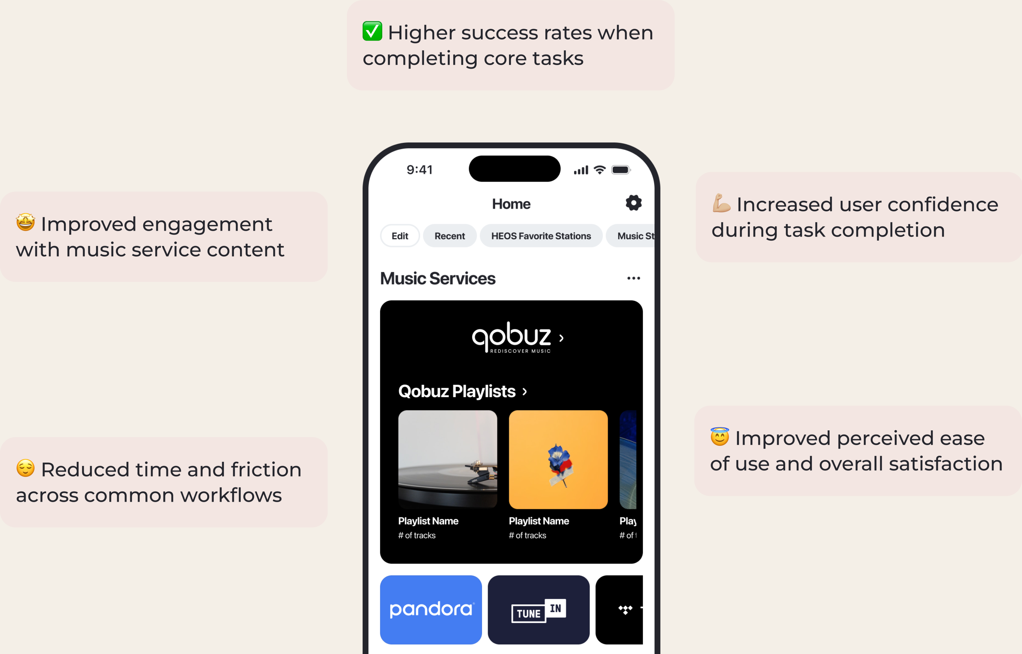 To support this, the HEOS app stays closer to native app patterns by incorporating each service’s brand colors, logos, and familiar browsing structures, helping reduce friction and cognitive load when switching between services.